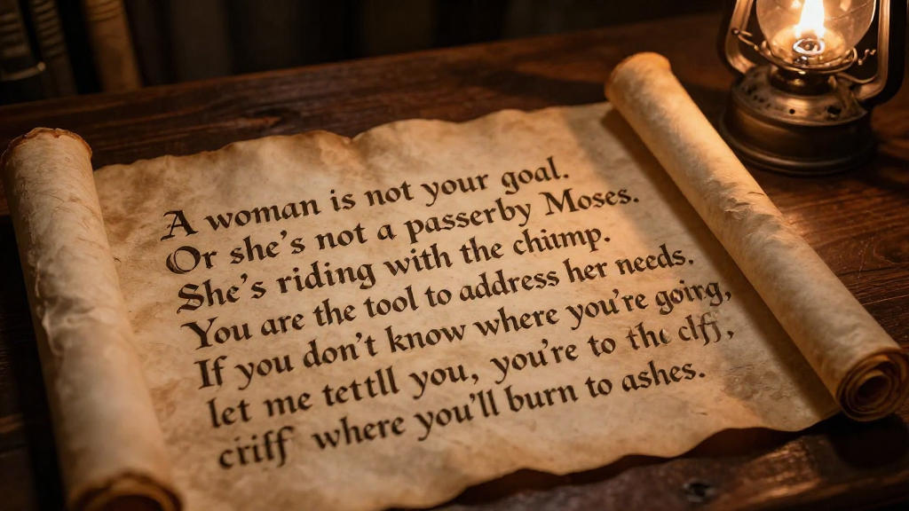 ሴት አላማህ አይደለችም። ወይም አሻጋሪ ሙሴህ አይደለችም። አዳኝህም አይደለችም። ከአሸናፊው ጋር ጋላቢ ነች። አንተ የፍላጎቷ አድራሽ መገልገያዋ ነህ። ወዴት እንደምትሄድ ካላወቅክ ደግሞ ልንገርህ፤ ወደ አመድ ወደምትቃጠልበት ገደል እየሄድክ ነው..!።
